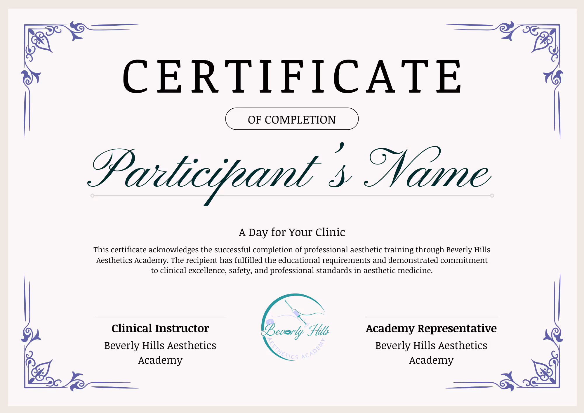 The A Day for Your Clinic Certificate recognizes completion of customized aesthetic training delivered through Beverly Hills Aesthetics Academy. This program is tailored to a clinic’s specific goals, protocols, and team structure.