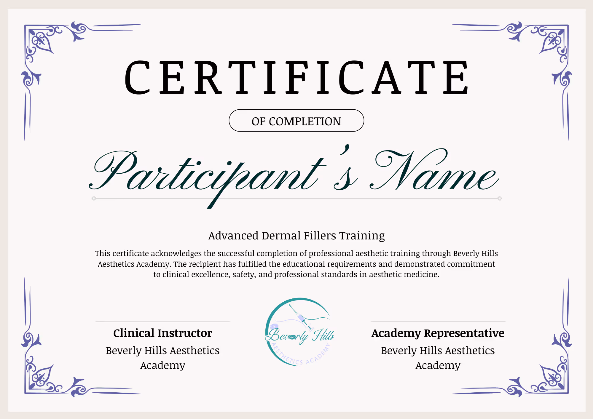 This Certificate of Completion confirms successful participation in Advanced Dermal Fillers training at Beverly Hills Beauty Academy. The course emphasizes advanced concepts, precision, and thoughtful treatment planning.